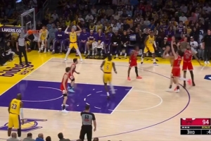 GIF-东契奇钻人缝直接抛投命中,但是不算,先犯规给两罚;雷迪克摊手,老詹不停的给裁判抱怨