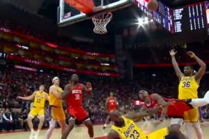 GIF-阿门冲筐造詹姆斯犯规 后者示意挑战
