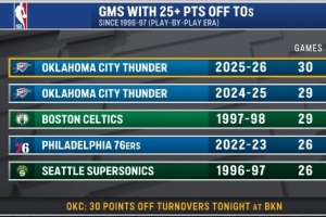 96-97赛季以来单赛季利用对手失误得到25+纪录: