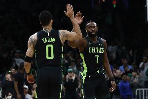 此役,杰伦·布朗出战39分钟17投9中,三分3中1,罚球14中12砍下31分8篮板8助攻2抢断;塔图姆出战35分钟12投5中,三分6中3、罚球6中6砍下19分12篮板7助攻3抢断1盖帽。