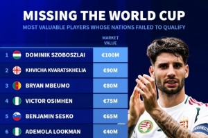 无缘今年世界杯球员身价排名(所在球队未晋级,不包含附加赛球队):