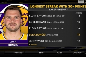 贝勒18场、科比16场、贝勒14场、东契奇12场、韦斯特12场。