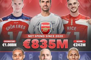 体育资讯03月05日讯 本赛季英超已经接近尾声,北伦敦双雄热刺和阿森纳的表现可谓天差地别。阿森纳目前高居英超榜首四线争冠,而热刺却在为保级而战。但在转会市场上,两支球队过去5年间的支出却相差无几。