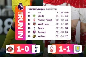 著名数据机构Opta的超级计算机演算结果显示,热刺目前的降级概率达到了46.5%,比西汉姆联(36.03%)高出了10个百分点。森林和利兹联的降级概率则不到10%。